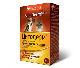 Показания:Цитодерм капли применяют собакам и кошкам для лечения острого, хронического, первичного и вторичного отитов наружного и среднего уха грибковой и/или бактериальной этиологии.