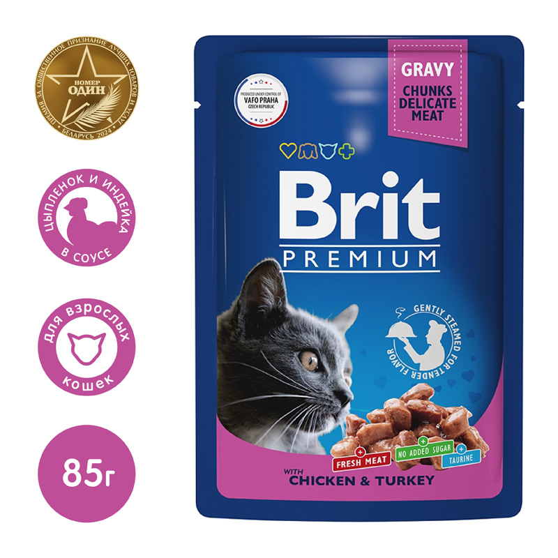 Нежные кусочки цыпленка и индейки в ароматном соусе - идеальное сочетание для полноценного и сбалансированного рациона. Паучи Brit Premium содержат все необходимые витамины и минералы, которые необходимы питомцу. Таурин в составе – важный ингредиент для поддержания остроты зрения и здоровья сердечно-сосудистой системы кошек. Паучи отлично дополнят полнорационный сухой корм Brit Premium и внесут разнообразие в питание Вашей кошки.