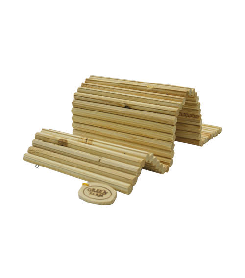 Игрушки ТМ Green Farm производятся из просушенной и обессмоленой древесины сосны высшего и первого сортов. Сосна имеет тонкий аромат древесины, имитирующий естественную среду обитания зверьков. Для грызунов деревянный домик это не только укрытие, но и идеальный материал для стачивания зубов. Поверхность изделий не обрабатывается химическими покрытиями, а при сборке используется только безопасный и нетоксичный клей ПВА, без скоб и гвоздей.