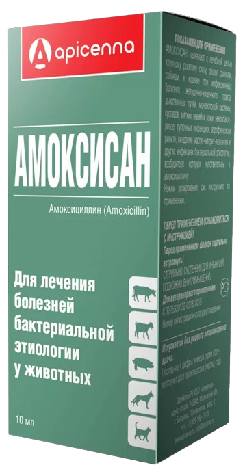 Действующий противомикробный компонент препарата в химическом отношении является полусинтетическим антибиотиком из группы пенициллинов и обладает широким спектром активности, как на грамположительные, так и на грамотрицательные микроорганизмы, включая штаммы: Staphylococcus spp., Streptococcus spp., Actinomyces spp., Meningococcus spp., Escherichia spp., Shigella spp., Salmonella spp., Pasteurella spp., Listeria monocytogenes, Clostridium spp., Haemophilus spp., Bacillus spp., Actinobacillus spp., Bordetella spp., Fusobacterium spp., Moraxella spp., Corynebacterium spp., Campylobacter spp., Erysipelothrix rhusiopathiae, Proteus mirabilis. Амоксициллин тригидрат не действует на пенициллиназообразующие бактерии Klebsiella spp, Enterobacter spp. и Pseudomonas spp. Амоксициллин тригидрат угнетает биосинтез клеточной стенки микроорганизмов, что приводит к ее гибели. После внутримышечного введения Амоксисана максимальная концентрация амоксициллина тригидрата в сыворотке крови достигается через 1 – 2 часа и удерживается на терапевтическом уровне в течение 48 часов. Выводится из организма амоксициллин тригидрат преимущественно с мочой и частично с желчью, в основном в неизмененной форме. Амоксисан по степени воздействия на организм теплокровных животных относится к умеренно опасным веществам.
