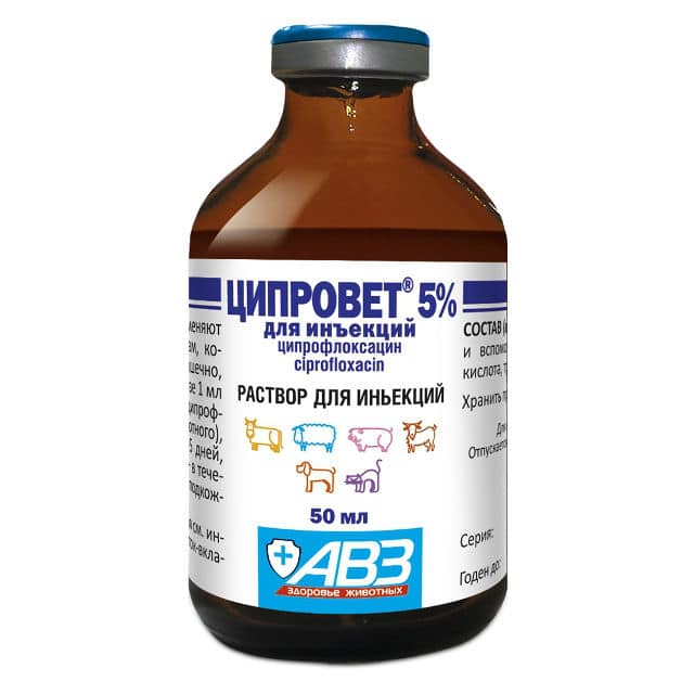 Ципровет 5% для инъекций применяют для лечения крупного рогатого скота, овец, коз, свиней, собак и кошек при инфекционных болезнях желудочно-кишечного тракта, дыхательных путей, мочеполовой системы, суставов, мягких тканей и кожи, некробактериозе, пупочных инфекциях, атрофическом рините, бронхопневмонии, колибактериозе, сальмонеллезе, пастереллезе, микоплазмозе, синдроме мастит-метрит-агалактия и других первичных и вторичных инфекциях бактериальной этиологии, возбудители которых чувствительны к ципрофлоксацину.