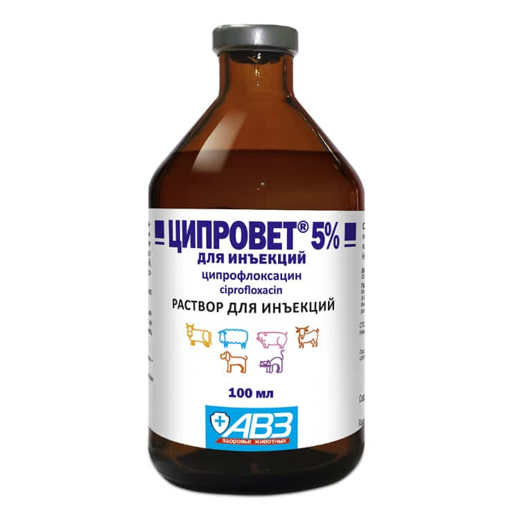 Ципровет 5% для инъекций применяют для лечения крупного рогатого скота, овец, коз, свиней, собак и кошек при инфекционных болезнях желудочно-кишечного тракта, дыхательных путей, мочеполовой системы, суставов, мягких тканей и кожи, некробактериозе, пупочных инфекциях, атрофическом рините, бронхопневмонии, колибактериозе, сальмонеллезе, пастереллезе, микоплазмозе, синдроме мастит-метрит-агалактия и других первичных и вторичных инфекциях бактериальной этиологии, возбудители которых чувствительны к ципрофлоксацину.