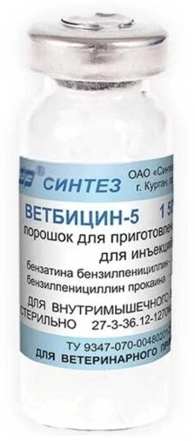 Ветбицин- 5 — комплексное антибактериальное средство, содержащее два биосинтетических пенициллина. Препарат активен в отношении грамположительных микроорганизмов, включая Staphylococcus spp., Streptococcus pneumoniae, Corynebacterium diphtheriae, анаэробных спорообразующих палочек, Bacillus anthracis и грамотрицательных микроорганизмов, в том числе Neisseria meningitidis, Actinomyces israelii, а также в отношении Treponema spp. Механизм бактерицидного действия пенициллинов основан на нарушении синтеза пептидогликана (мукопептида), входящего в состав клеточной стенки микроорганизмов, путем ингибирования ферментов транспептидазы и карбоксипептидазы, что приводит к нарушению осмотического баланса и разрушению бактериальной клетки. После внутримышечного введения Ветбицин-5 всасывается в кровь и сохраняется в терапевтической концентрации на протяжении 7-10 суток. Выводится из организма главным образом с мочой и частично с фекалиями. Ветбицин-5 по степени воздействия на организм теплокровных животных относится к 3 классу опасности (вещества умеренно опасные).