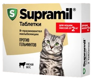 Supramil таблетки назначают взрослым кошкам и котятам с лечебной и профилактической целью при кишечных нематодозах, цестодозах и смешанных инвазиях.