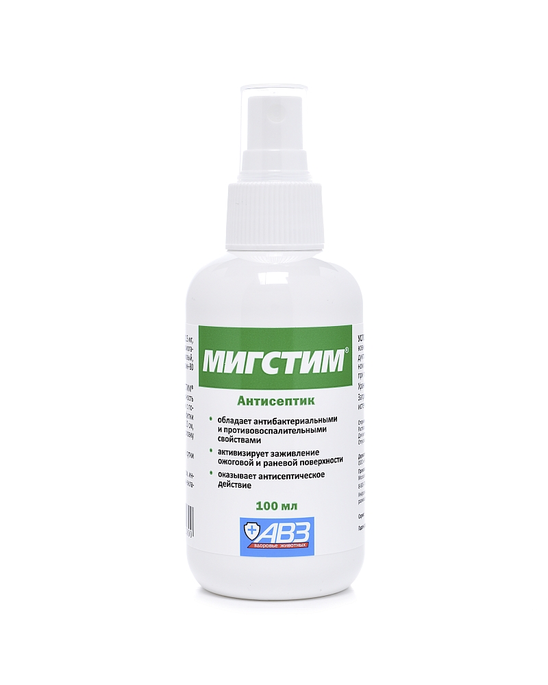 В качестве действующих веществ содержит мирамистин – 0,015%, экстракт ромашки – 2%, сукцинат хитозана – 0,1% и спирт этиловый – 8 %. Мигстим относится к комбинированным антисептическим препаратам, активен в отношении большинства грамположительных и грамотрицательных патогенных микроорганизмов, включая синегнойную палочку, золотистый стафилококк, кандиды и хламидии. Входящие в состав препарата активные компоненты обладают выраженными антибактериальными и противовоспалительными свойствами, стимулируют репаративные процессы и функциональную активность иммунокомпетентных клеток, оказывая иммуномодулирующее действие в патологическом очаге. Происходит активизация заживления раневой или ожоговой поверхности без излишнего образования рубцов.