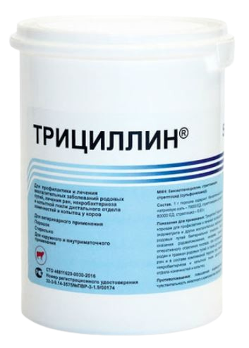 Трициллин представляет собой смесь пенициллина, стрептомицина и белого растворимого стрептоцида, предназначенную для профилактики и лечения при заболеваниях родовых путей у коров. Указанное сочетание лекарственных препаратов обуславливает синергетическое действие компонентов на патогенные микроорганизмы, благодаря чему повышается лечебное действие каждого из компонентов. Трициллин выпускается промышленностью в форме таблеток и в форме порошка, расфасованных во флаконы (таблетки могут быть упакованы в целлофан и расфасованы в конвалюты). В одном флаконе или в одной конвалюте имеется 8 таблеток по 0, 75г трициллина или 4 таблетки по 1, 5г препарата. Всего в одном флаконе или конвалюте содержится 6г препарата. Одна таблетка трициллина весом 0, 75г содержит в себе 50 000 ед. пенициллина, 50 000 ед. стрептомицина и 0, 5г стрептоцида. Одна таблетка трициллина весом в 1, 5г содержит 100 000 ед. пенициллина, 100 000 ед. стрептомицина и 1г стрептоцида. В состав каждой таблетки входит также наполнитель – вещество, не раздражающее ткани половых органов. По внешнему виду это круглые таблетки белого или серовато-белого цвета. В воде при температуре 27 С и легком взбалтывании таблетки распадаются в течение 10 минут. Один флакон с трициллином в порошке содержит 400 000ед. пенициллина калиевой или натриевой соли, 500 000 ед. стрептомицина сульфата и 5г белого растворимого стрептомицида.