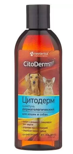 CitoDerm шампунь дерматологический является косметикогигиеническим средством, которое предназначено для ухода за кожей и шерстью животных, склонных к дерматитам. Способствует отшелушиванию ороговевших клеток кожи, а благодаря эфирным маслам благотворно влияет на кожно-волосяной покров.