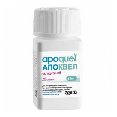 Апоквел 3,6 содержит в 1 таблетке в качестве действующего вещества оклацитиниба малеат (в пересчете на оклацитиниб) 3,6 мг; а также вспомогательные вещества: микрокристаллическую целлюлозу, лактозы моногидрат, карбоксиметил-крахмал натрия, магния стеарат, плёнкообразователь «Opadry II White» и воду очищенную.