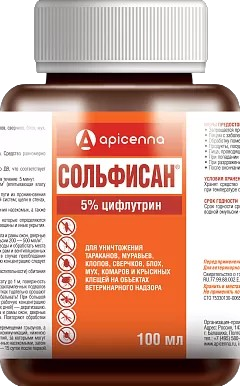 Действующим веществом Сольфисана является цифлутрин, который относится к группе синтетических пиретроидов и обладает широким спектром инсектоакарицидного действия в отношении тараканов, муравьев, клопов, сверчков, блох, мух, комаров и крысиных клещей.