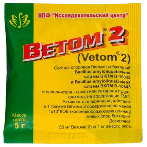 Препарат вводят животным внутрь индивидуально или групповым методом с кормом, молоком, молозивом, кипяченой остуженной водой, а также можно вводить ректально после очистительной клизмы. Растворы готовят непосредственно перед применением. С лечебной целью препарат применяют в дозе 50 мг на 1 кг веса животного 2 раза в сутки в течение 14 дней. Для коррекции иммунодефицитных состояний Ветом 2 дают животным в дозе 50 мг на 1 кг веса животного 1 – 2 раза в сутки в течение 5 – 10 дней. Для профилактики болезней органов пищеварения Ветом 2 назначают животным сразу после рождения 1 раз через день по 50 мг на 1 кг веса животного в течение 10 дней. Ветом 2 может быть задан с кормом из расчета 1,5 кг на 1 тонну корма.