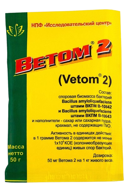 Препарат вводят животным внутрь индивидуально или групповым методом с кормом, молоком, молозивом, кипяченой остуженной водой, а также можно вводить ректально после очистительной клизмы. Растворы готовят непосредственно перед применением. С лечебной целью препарат применяют в дозе 50 мг на 1 кг веса животного 2 раза в сутки в течение 14 дней. Для коррекции иммунодефицитных состояний Ветом 2 дают животным в дозе 50 мг на 1 кг веса животного 1 – 2 раза в сутки в течение 5 – 10 дней. Для профилактики болезней органов пищеварения Ветом 2 назначают животным сразу после рождения 1 раз через день по 50 мг на 1 кг веса животного в течение 10 дней. Ветом 2 может быть задан с кормом из расчета 1,5 кг на 1 тонну корма.
