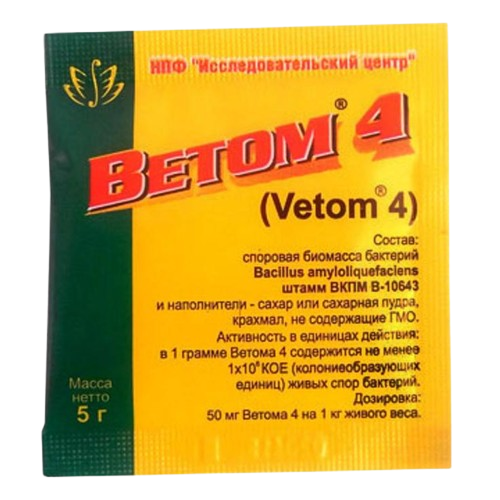 Ветом 4 обладает высокой антагонистической активностью к широкому спектру патогенных и условно патогенных микроорганизмов за счет свойств Bacillus subtilis. Препарат предупреждает развитие дисбактериоза, повышает неспецифическую резистентность организма и нормализует обмен веществ.