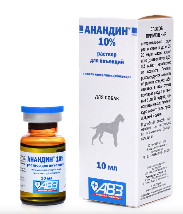 Больным собакам препарат вводят внутримышечно в дозе 20 мг на 1 кг массы животного (0,2 мл на 1 кг массы) независимо от возраста один раз в день. Курс лечения — 3 дня подряд, при запоздалом лечении срок может быть продлен до 4 – 6 дней. Совместно с анандином можно использовать антибиотики, сульфаниламиды, гормоны и сыворотки.