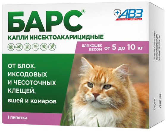 БАРС капли инсектоакарицидные применяют собакам и кошкам для лечения и профилактики заболеваний вызываемых блохами (афаниптероз ), иксодовыми клещами (иксодидоз), вшами (линогнатоз, триходектоз), чесоточными (саркоптоз, нотоэдроз, отодектоз) и тромбидиформными (демодекоз, хейлетиеллез) клещами, в комплексной терапии аллергического дерматита, вызываемого укусами блох, а также в целях защиты от нападения двукрылых кровососущих насекомых.