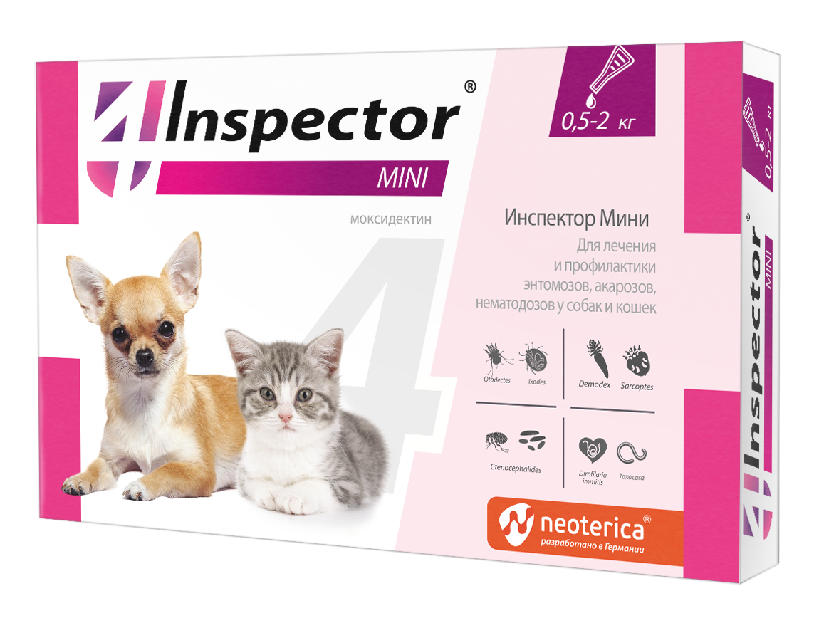 Инспектор Мини назначают котятам, щенкам, а также собакам и кошкам мелких пород для лечения и профилактики энтомозов (блохи, вши, власоеды), акарозов (иксодидозы, отодектоз, нотоэдроз, саркоптоз, демодекоз) и нематодозов желудочно-кишечного тракта (токсокароз, токсаскаридоз, унцинариоз, анкилостомоз, трихоцефалез), а также в целях профилактики дирофиляриоза.