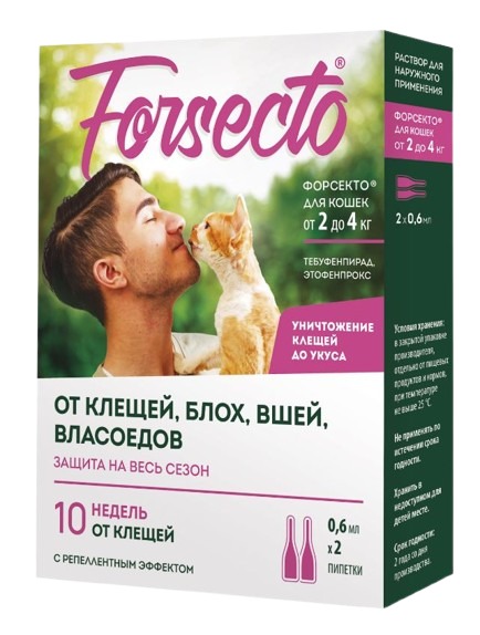 При совместном содержании собак и кошек не следует допускать контакта кошки с обработанной собакой до полного высыхания мест нанесения препарата на собаке. Запрещается применение лекарственного препарата FORSECTO кошкам в период беременности и вскармливания потомства, а также котятам моложе 12-недельного возраста и/или массой менее 2 кг.