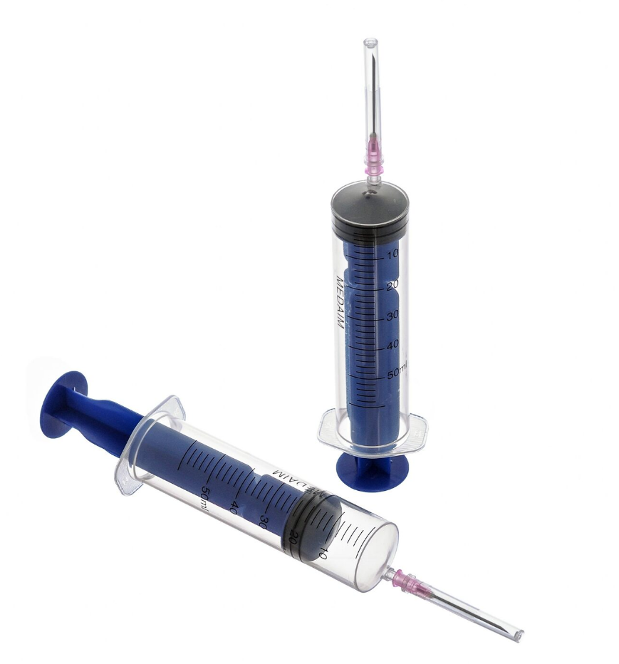 Шприц 50 мл MEDAIM инъекционный однократного применения, трехкомпонентный с резиновой двойной уплотнительной манжетой на поршне с иглой 1,2х40мм (18Gx1½"), из нержавеющей медицинской стали марки SUS304, заточка иглы лазерная трехгранная копьевидная, обработана медицинским силиконом, закрыта колпачком.