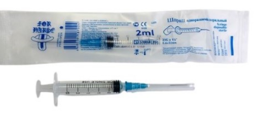 Шприц инъекционный объемом 2 мл, стерильный, одноразовый трехкомпонентный