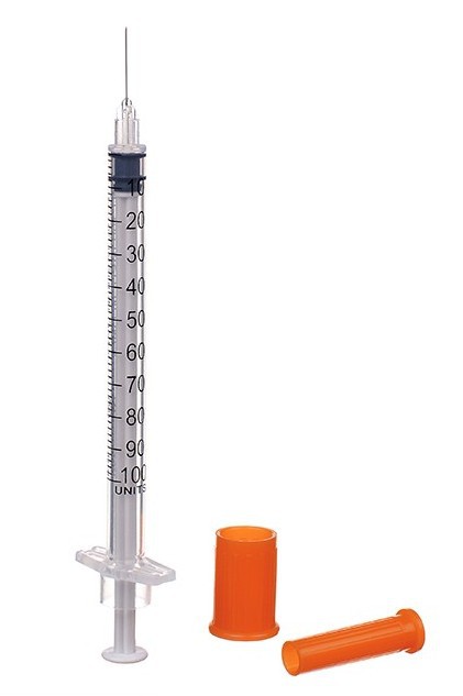 Шприц инсулиновый, трехкомпонентный, объем 1 мл, с иглой, соединение интегрированное, положение канюли центральное.