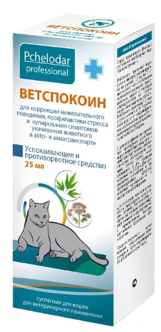 ВетСпокоин (VetSpokoin) для кошек содержит в 1 мл на 5 кг веса действующие вещества: фенибут – 20 мг, экстракт пустырника – 4 мг, экстракт валерианы – 5 мг, прометазина гидрохлорид – 2,5 мг, пчелиное маточное молочко – 0,5 мг и вспомогательные компоненты.