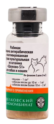 Вакцина антирабическая инактивированная сухая культуральная из штамма «Щелково-51» для собак и кошек.